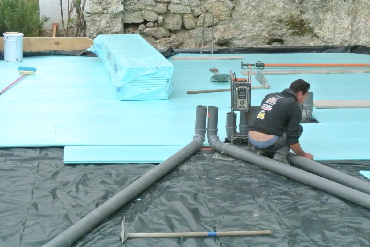 The guys arrived about 8:45. Cloudy and windy but not that cold outside. They put down a layer of black plastic only cutting a hole for the middle support pole. Then they played down the 3cm blue insulation, tubes for the cables. Around the edges of the tubes and anywhere there is a gap they sealed this with some polyurethane foam stuff. Then they lay the steel in. This will be slightly lifted up on some bricks so the steel will be in the middle of the 15cm slab. Paul estimates it will be 12m3 of cement. Two big trucks.. Wow… It is supposed to rain on Thursday. I hope not too much. They were to come at 8 but now the cement will not come until 14. They are ready so it looks like they will not work tomorrow.