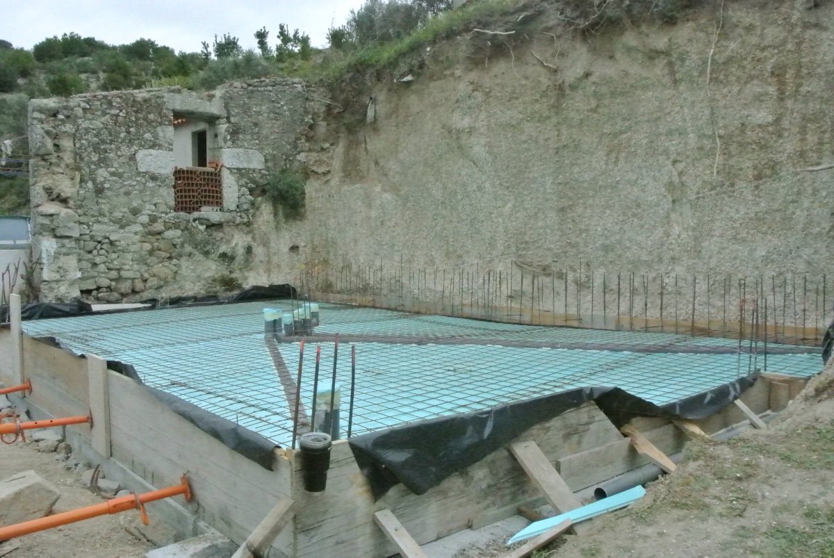 As for the concrete the price is 90€/m3 including the concrete pump truck.... I have no idea if this is cheap or not. We have poured 25m3 so far for the footings and the foundation. The retaining wall at the back will be about another 12m3, I think... Then we are done with the big pours. Phew..