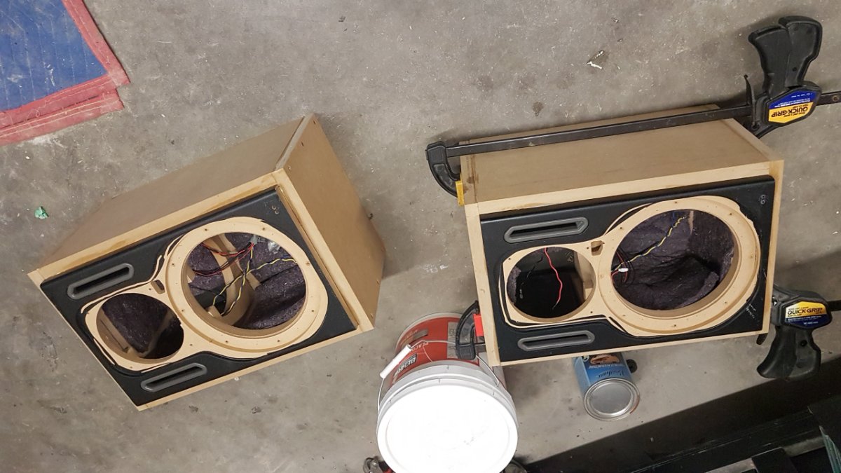 After some measurements, I rebuilt the front wall. Beefier framing, and tuned the monitors on their side for a wider stereo image. Also added a big metal plate VPR type absorber on the front wall, and rebuilt the speaker boxes to beef them up. I also performed an ampendectomy so I could get rid of the cooling ducting. Finally finished it off with some 3/4" walnut plywood on top of the 3/4" MDF. Moved some gear in place, and just about ready to rock!