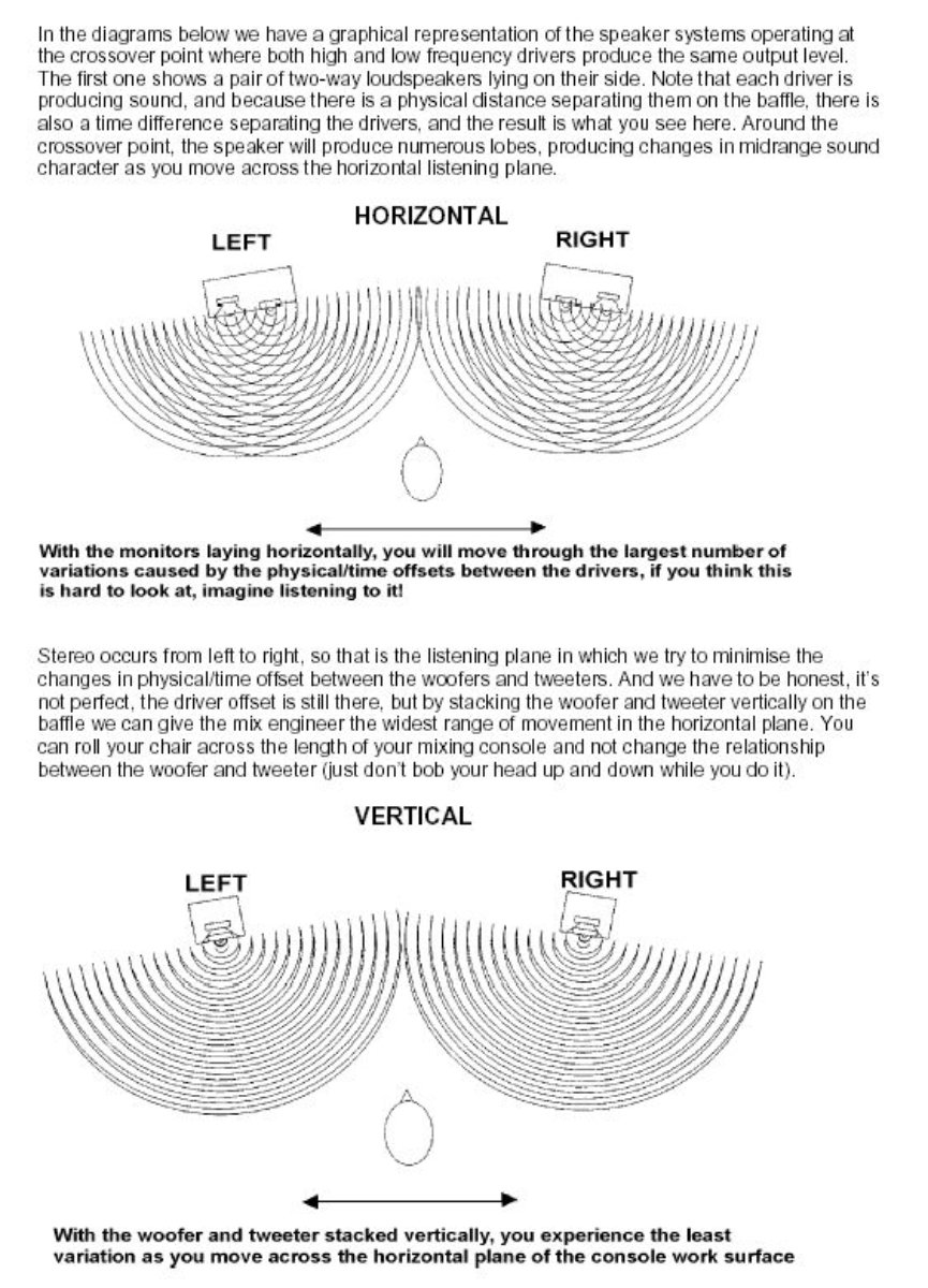 It probably would have been better to move the speakers physically further apart, rather than rotating them to horizontal. Here's why: The effect isn't huge, and only covers about an octave either side of the crossover point, but it can be noticeable with some speakers. Best avoided, unless the speakers are specifically designed to be used only horizontally.and tuned the monitors on their side for a wider stereo image.