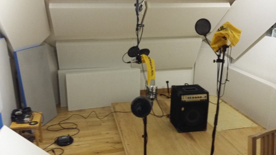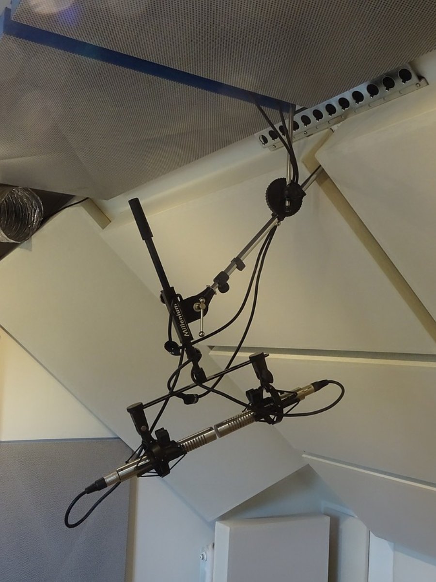 Speaking of isolation of mics from instruments, here's a variation on that theme from those sessions. Kick drum mic on the floor, kick drum on the riser. The drum kit overheads are attached to a stand coming from the ceiling, so they are also decoupled.