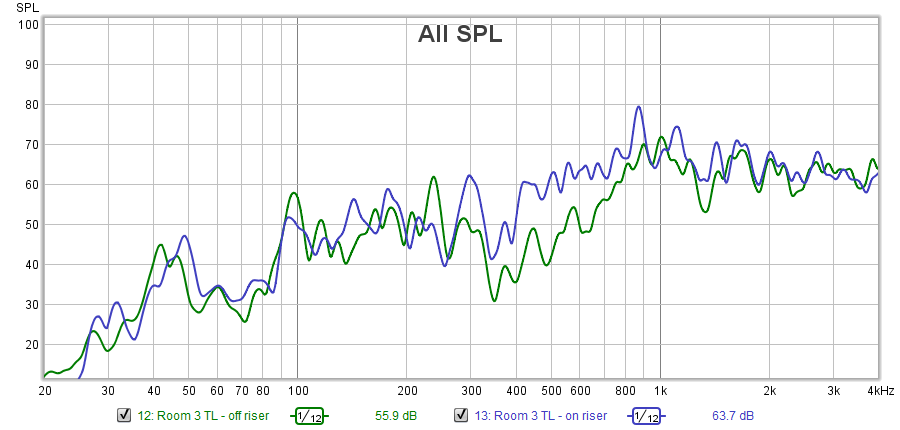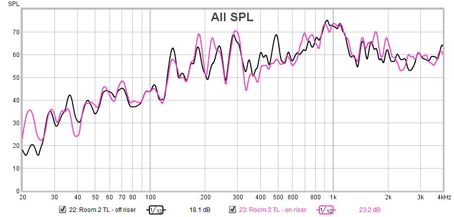Soundman2020 wrote:Source of the postThere's some differences, but as you say, not all that significant. But you say you can definitely hear the difference, subjectively, and it is very noticeable? That implies two things: 1) the original tests might not have been valid, or done with the mic ans speaker in different locations. 2) There is still significant "bleed" through other paths, different from the floor. Probably airborne transmission. The floor isolation from the riser would mainly affect structure-borne isolation: the riser won't accomplish much for air-borne.