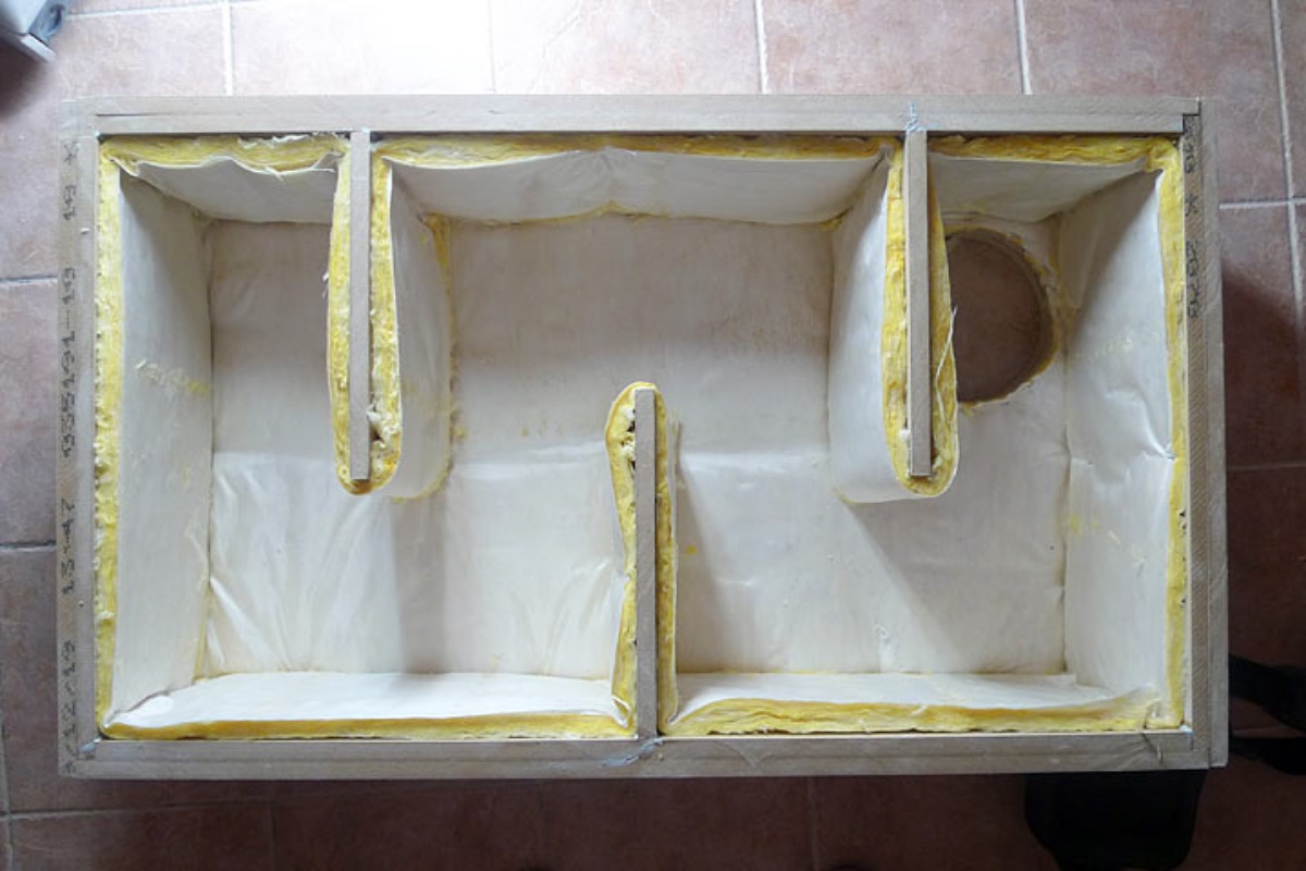 Because the design of my baffle boxes uses the wall outside the studio and the wall and ceiling inside as part of the boxes, putting the duct liner in was an interesting challenge.