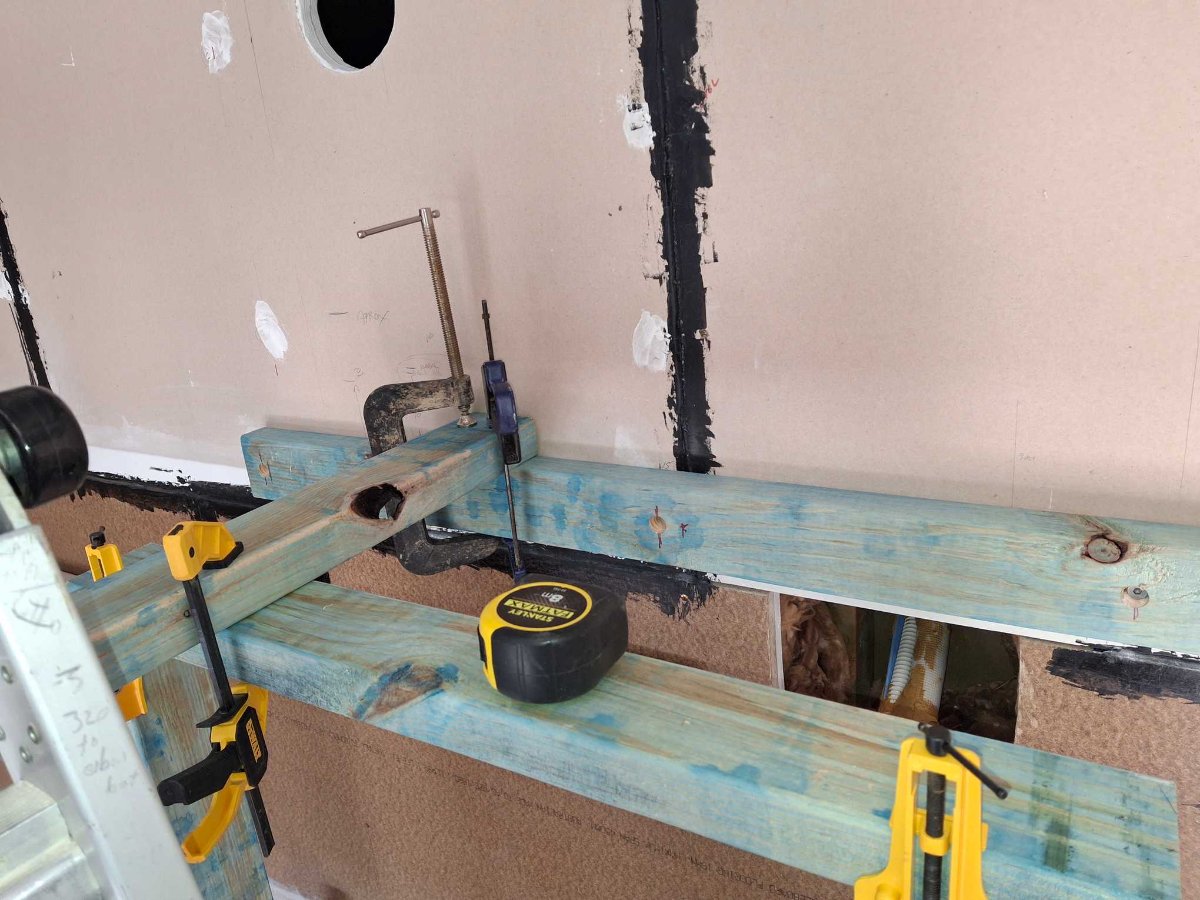 I needed to bolt a C section steel purlin to the first timber joists at both ends of the room to increase the load bearing capacity. However, the steel purlin needed to be supported directly by the wall frame and I had progressed the frame and sheeting too far at this point to get the steel purlins to land on the existing wall frame. His solution was to add a vertical supporting stud inside the room under the steel purlin at either end and bolt that stud through the wall sheeting to the frame.