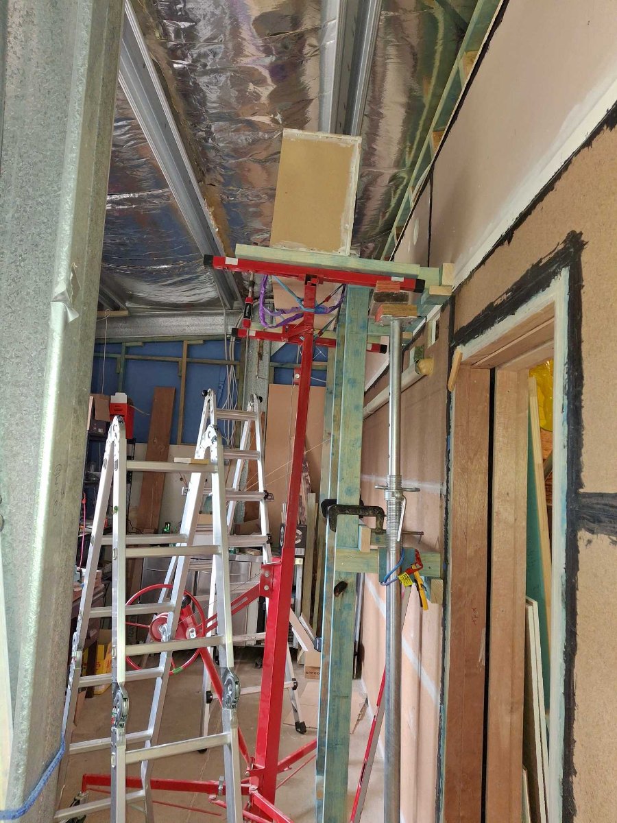 Nothing ground breaking here but I have observed that every “wrinkle” you have – in my case, column boxing and the ceiling rake adds soooo much time relative to straightforward drywall (gyprock) wall hanging and sealing.