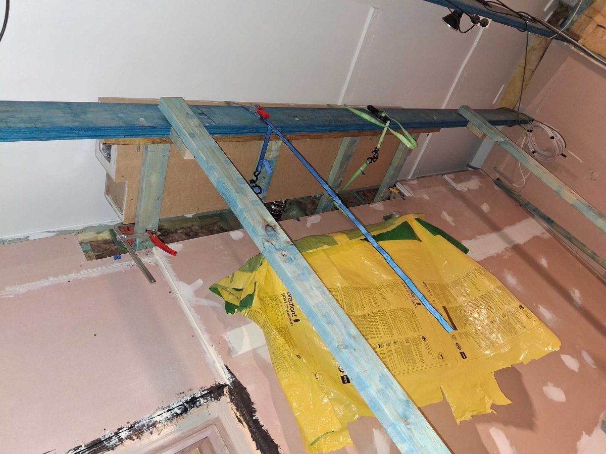 The drywall lift and acrow props got the job done (with a few straps for safety) :D