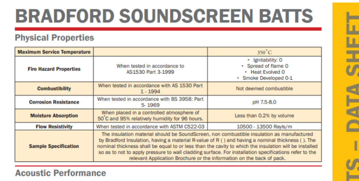 What I had in mind was Bradford Soundscreen batts – gas flow resistivity falls within range of 10,500 – 13,500 Rays/m.