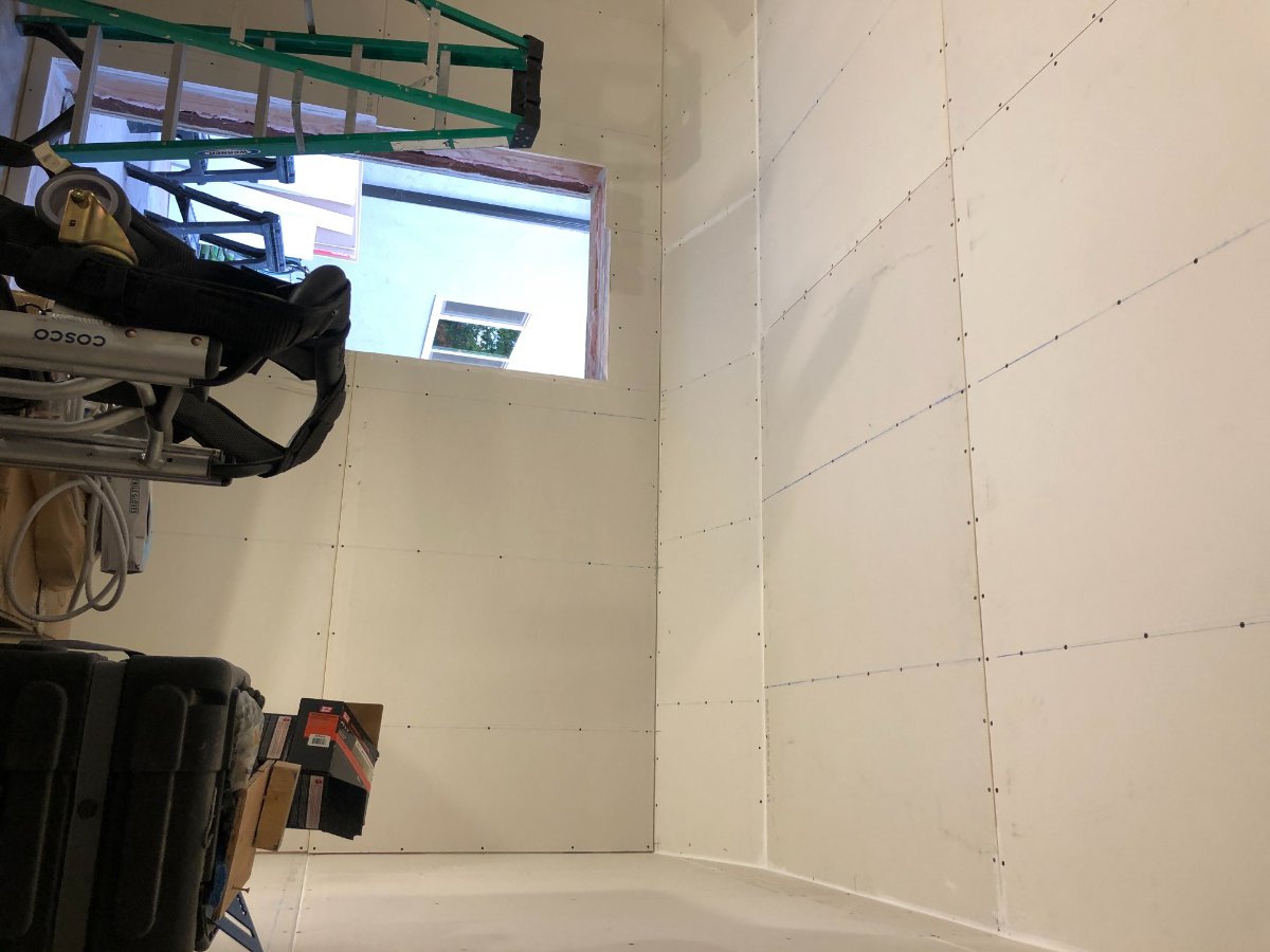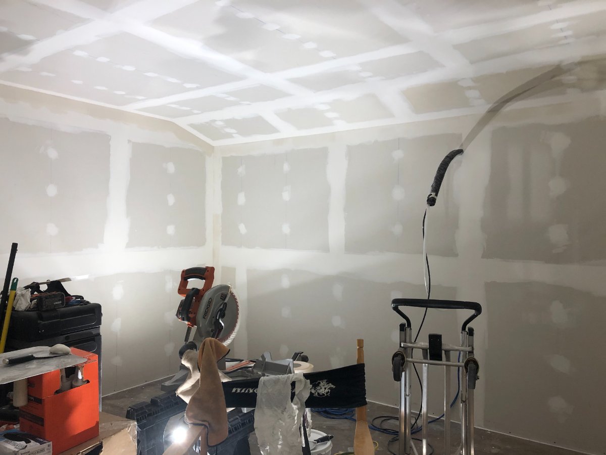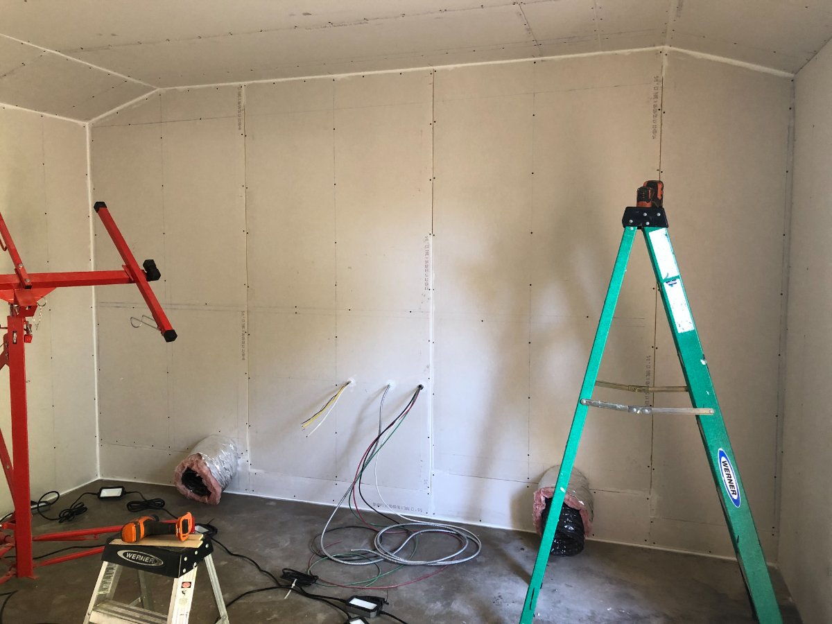 Next up was continuing the first layer of drywall on all 4 walls. I used a dremel with a drywall cutting bit and circle cutting jig to cut the wholes for the HVAC flex ducts penetrating through the north wall.