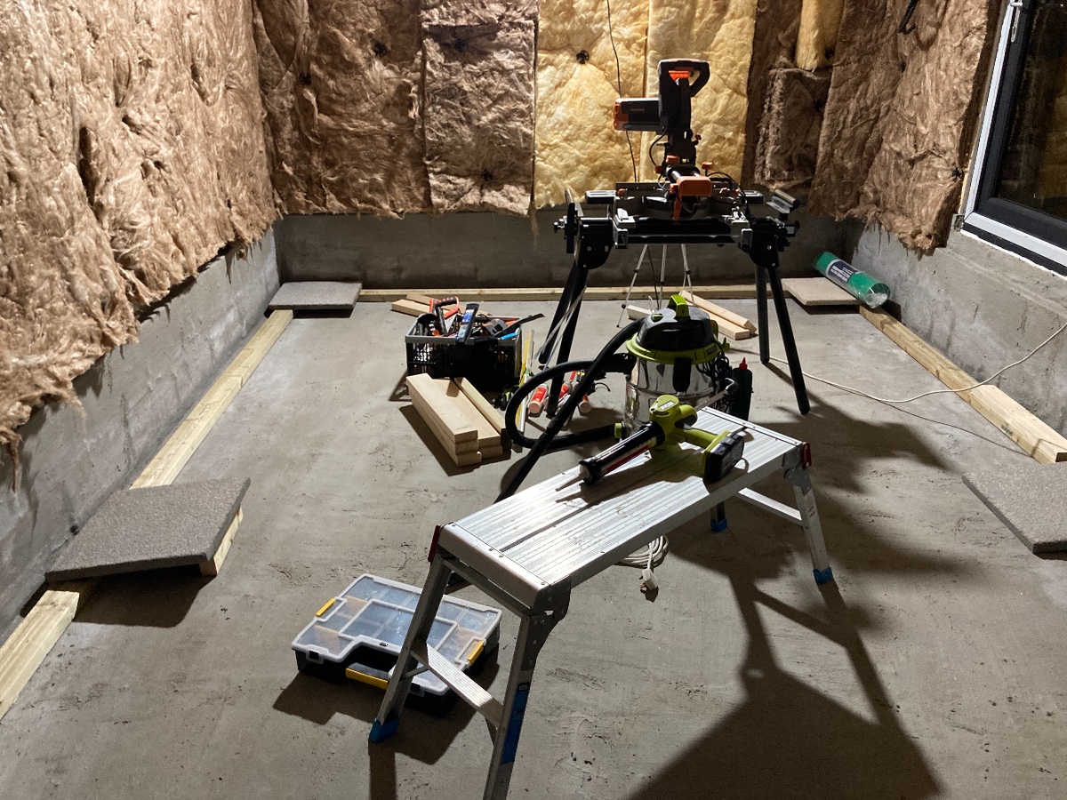 The title says it all. I turned the studio room with its freshly created floor into a woodworking workshop today and table saw cut all the bits for two silencers. Each is the width of the room, both will sit on top of the stud framing, at each end of the room. This means that both will be mostly hidden from below by either soffit walls for speakers, or hangers for rear wall bass trapping.