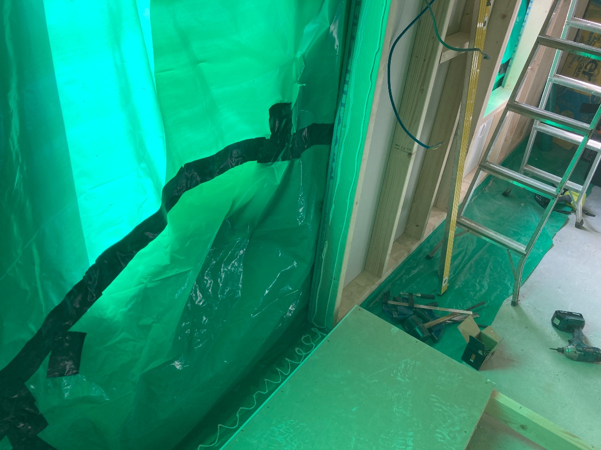 On Monday I cut and made the stud wall frames for the inner walls, in 10 sections that would be liftable. Tuesday I finished these and added plasterboard to the three frames for the back wall, ready to lift with my brother in law who joined me on Wednesday. We managed to finish and lift 6 out of 10 sections before he had to go for the school run, so on Thursday I managed to finish the remaining 4 with assistance from my partner Michelle. Each wall section is 4x2 stud, then two layers of 15mm plasterboard with the gaps overlapped. Where wall sections meet I overlapped the second layer of plasterboard by 20mm, and as each section went up copious sealant was applied to all the bits it touched!