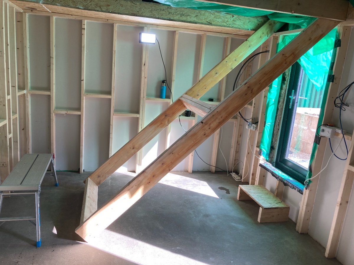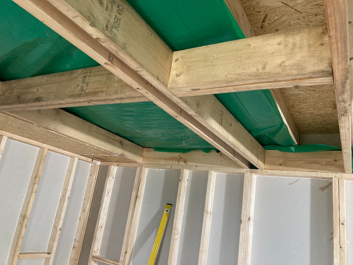 I had to do that with the stud framework otherwise it would not have stood up on its own. It was only after the insulation and a layer of OSB went up that we could connect the 4 walls to each other and remove the temporary ties. When the ceiling went up it provided the extra dimension of stability. It is a concerning point in the progress but having walked that path I can reassure you that it will work out alright but it is important to remove the temporary ties to avoid flanking paths.garethmetcalf wrote:Source of the post... the walls (which I’ll temporarily be attaching to the exterior ceiling joists until the inside room joists are fitted).
