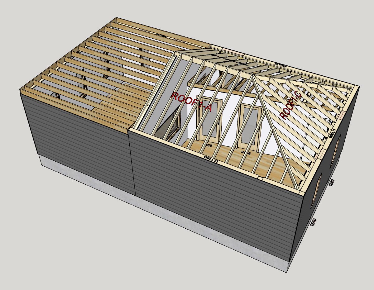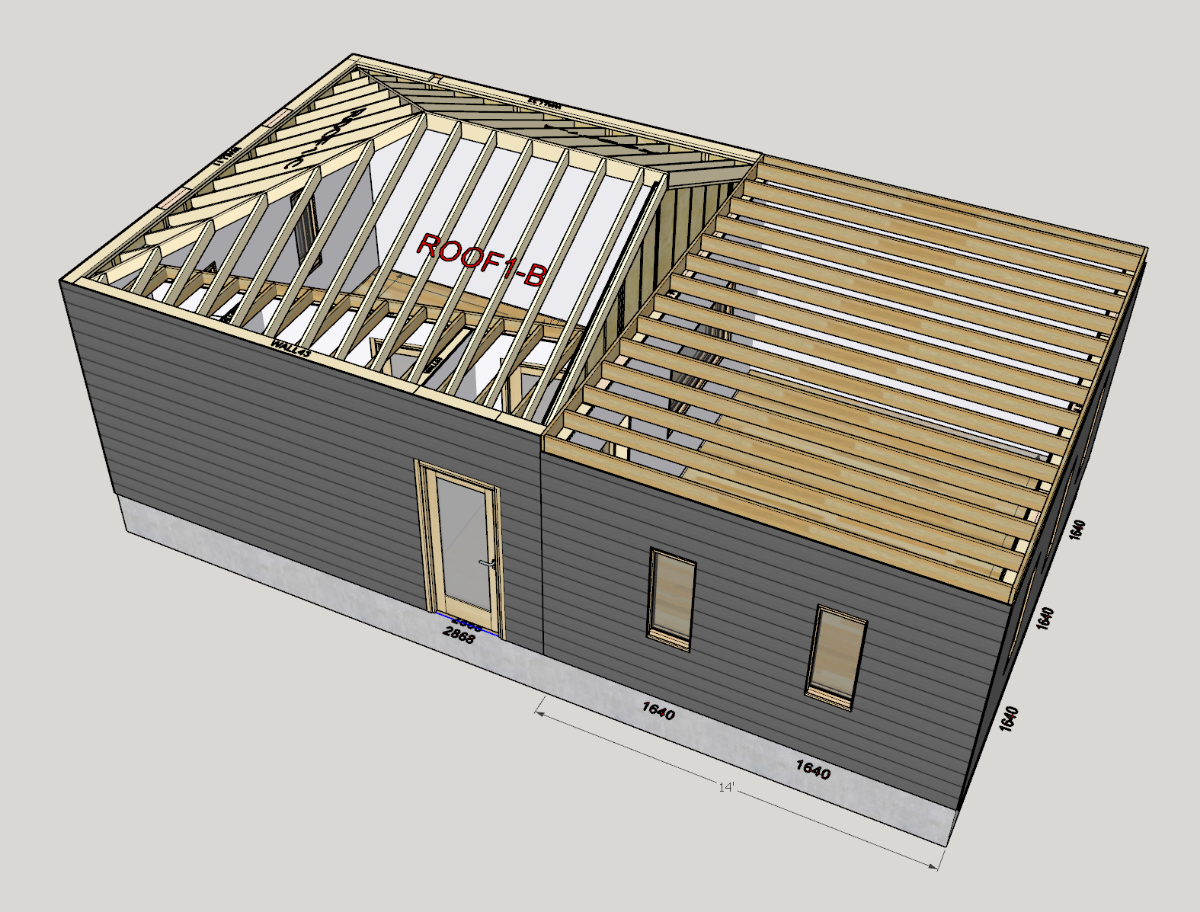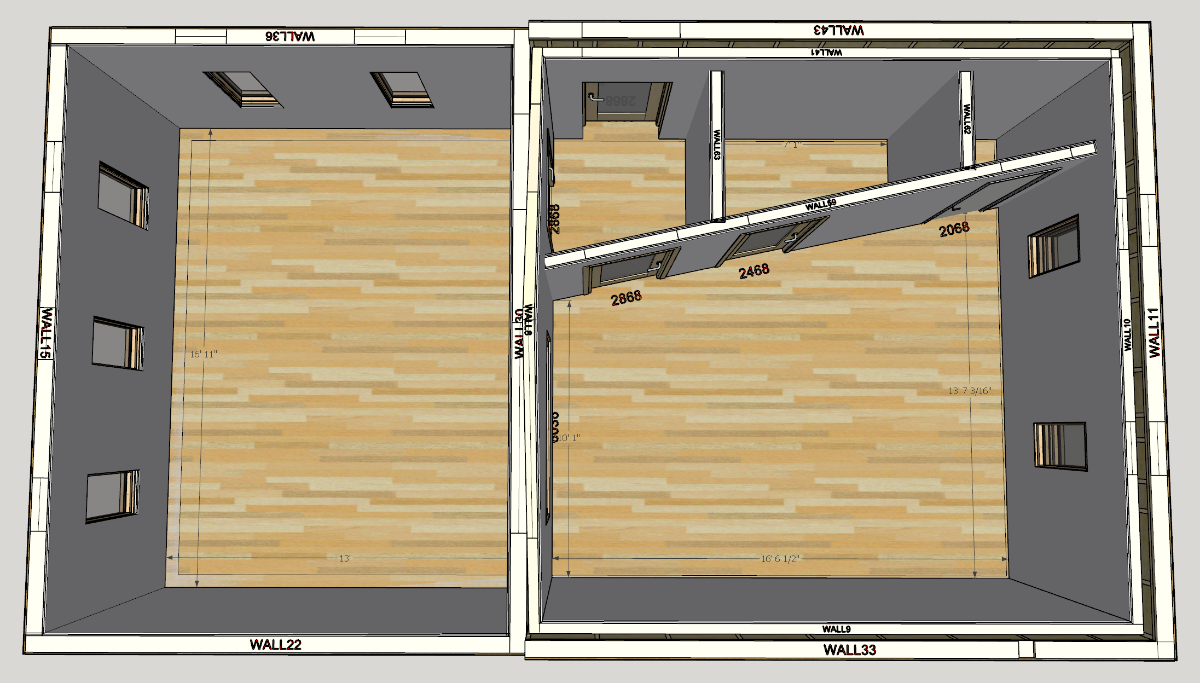 All that said, here are the sketchups for the final build. As you can see I have a lot of space to do soffits to enclose HVAC, more places for storage and I got all the things I wanted out of it. Small booth, Live room with vaulted ceilings, BIG control room and lots of natural light throughout. Im sure I will regret the placement of the window into the live room, but honestly I had to start making decisions based on needs. I saw some cool ways to deal with hiding the window during mixing, so I'm not too worried about it. Still planning a sofit mounted speaker setup etc, and I will be coming back with more questions as things start to ramp up on the build.