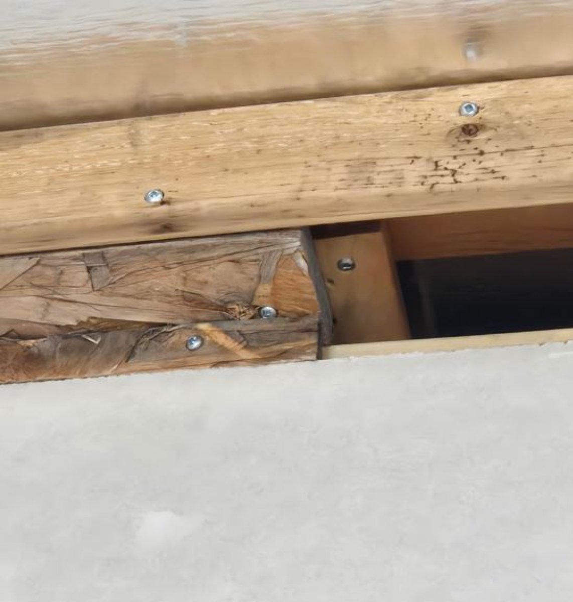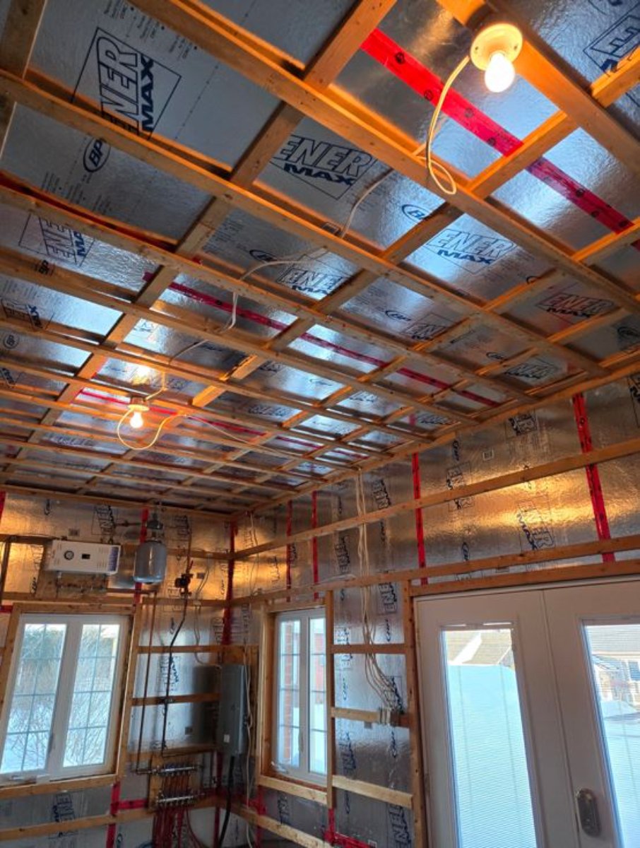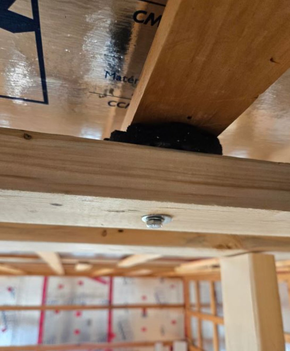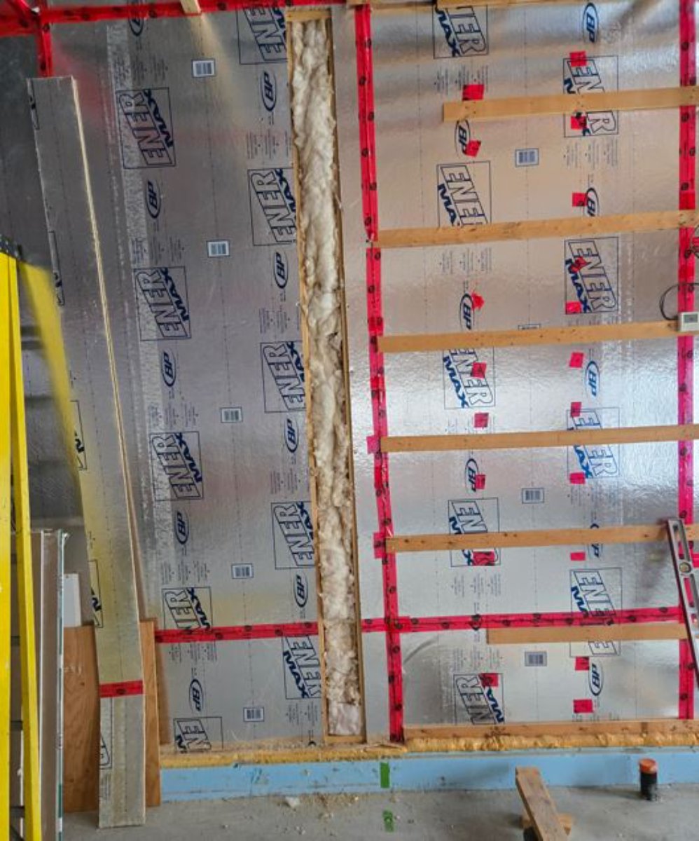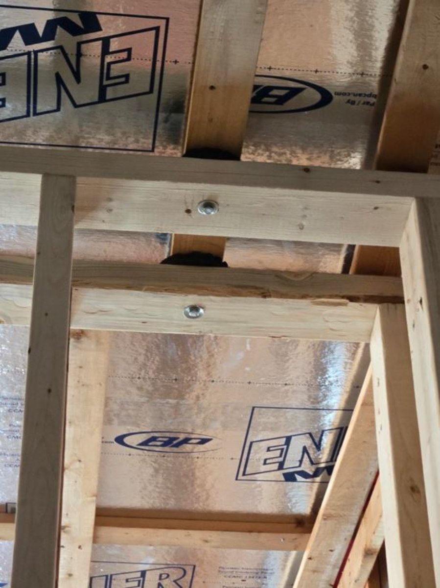 To fix the walls directly to the trusses, we had to add pieces of 2x4 between 2 trusses in different places (to fix the top plate with acoustic clips, for example). The option of doing it through the attic seemed so much like a nightmare to us (difficult to walk on the trusses, to move around, impossible to stand, wearing a mask, providing lighting, etc.) that the option of doing it from the inside (by removing pieces of Enermax) did not come to our mind. Yet, we did it to add studs on the exterior walls! What idiots we are...
