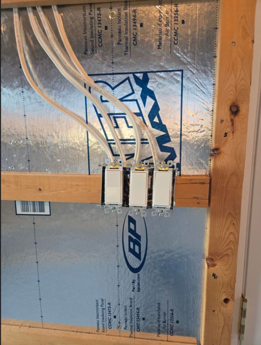 He first installed (temporarily) a few electrical outlets, two lights, and the switches at the entrance. This has already been planned in my electrical plan (which I will soon publish in the design forum). The breakers for the studio equipment will be on one phase and the other things (lights, fridge, treadmill, etc.) on the other phase. However, the breaker for the radiant floor system must use both phases.