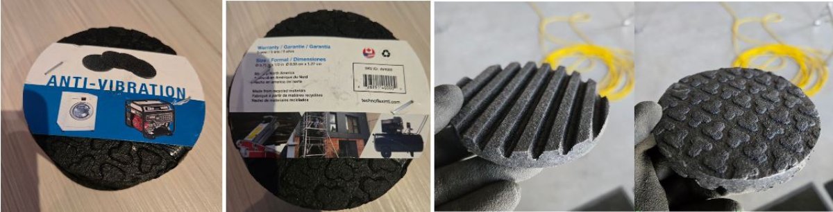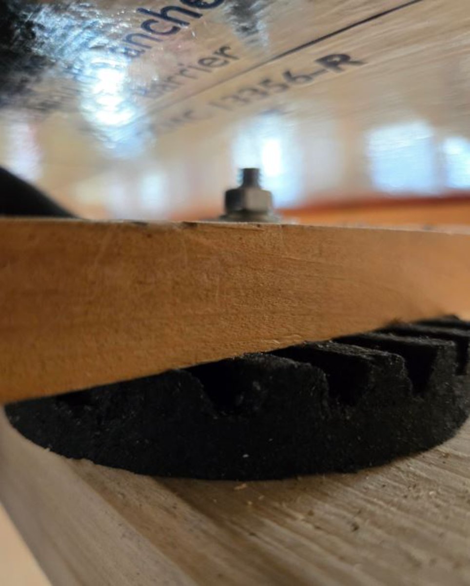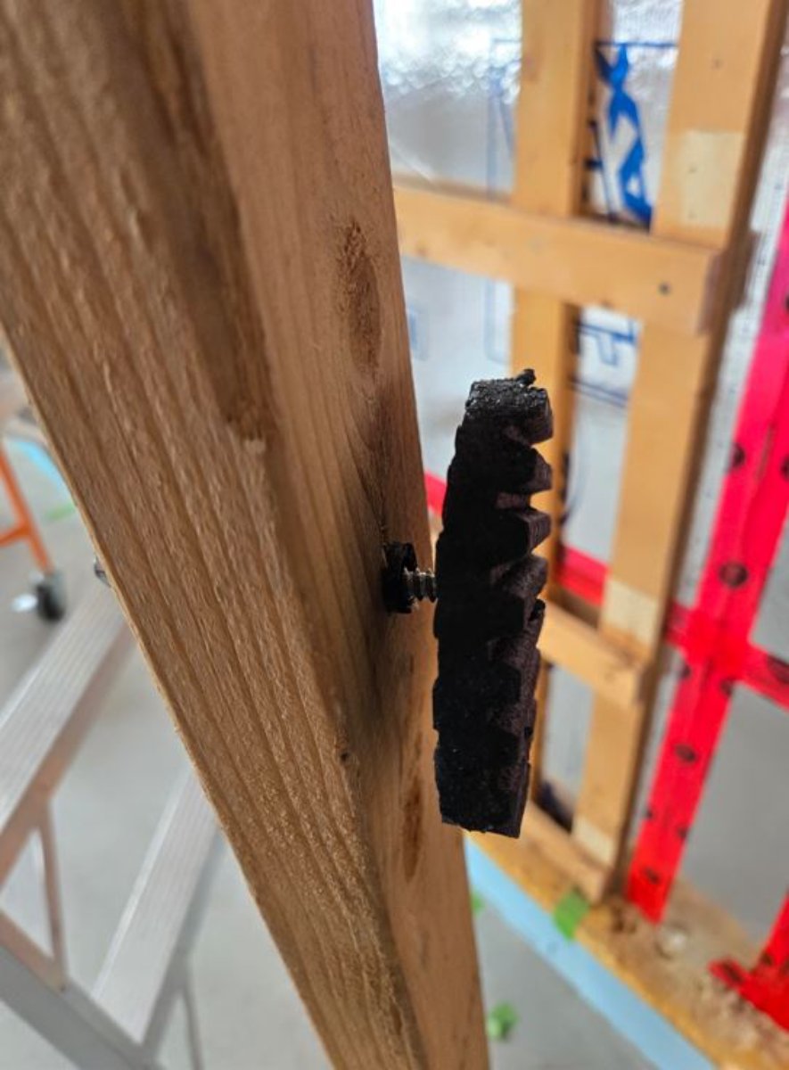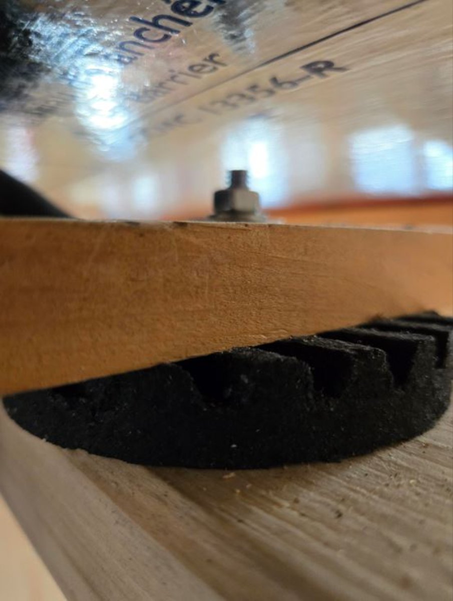 We first attached a decoupled 2x4 to the Enermax. To do this, we used anti-vibration rubber pucks and pieces of rubber tubing inside the 2x4 to insert a lag screw. The tubing protrudes a little on each side, so by screwing the lag screw into the 2x6 (through the Enermax), the washer flattens the tubing on one side and on the other, the tubing merges with the puck. 4 washers for each 2x4.