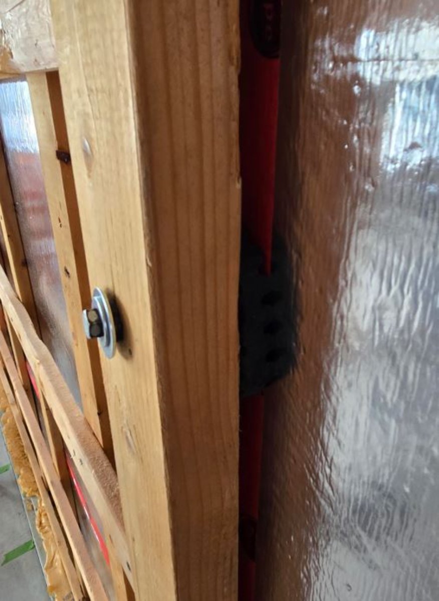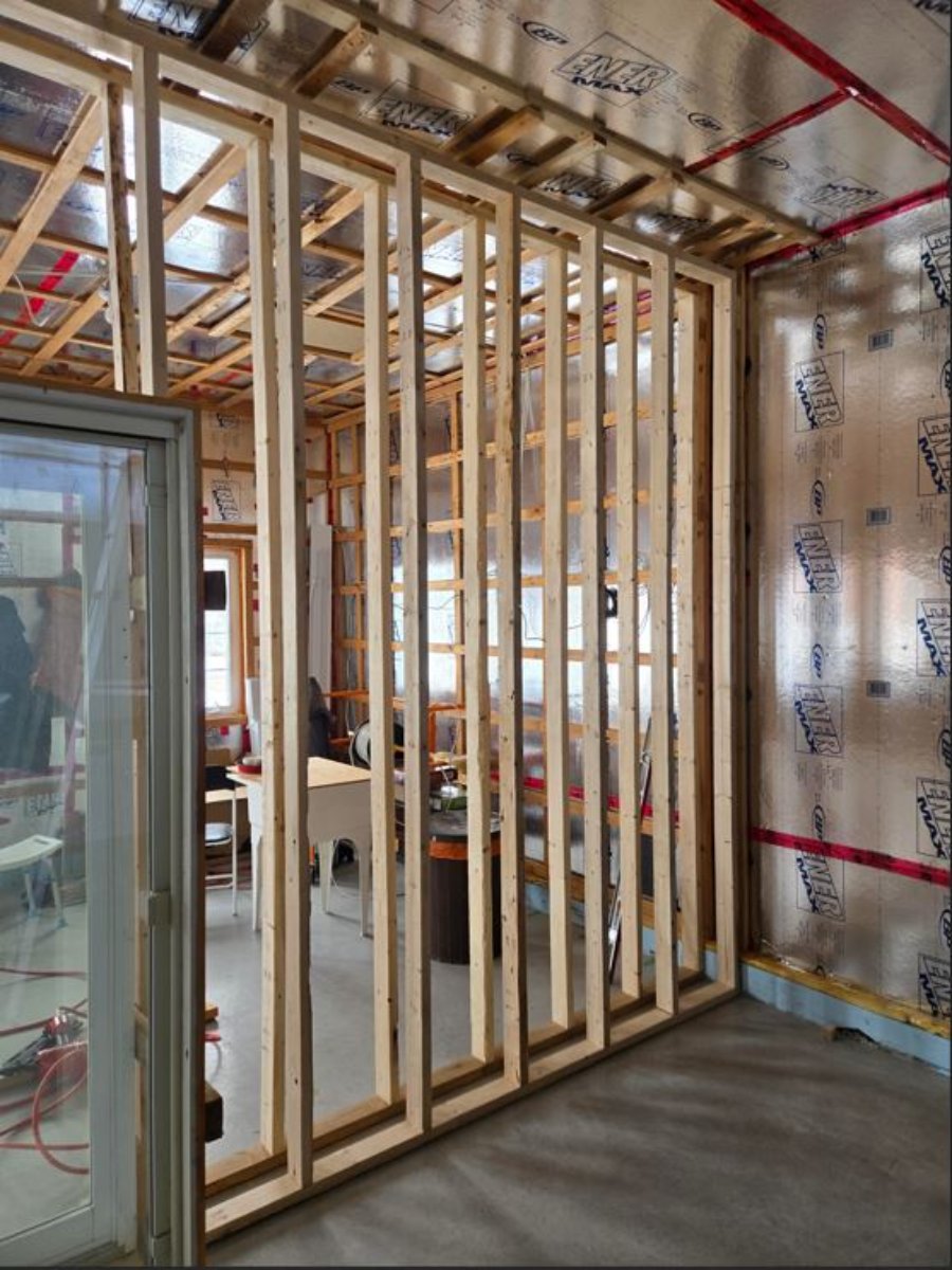 But the 2x4 attached to the Enermax is too far from the floor, we need another layer of 2x4. So we attached 4 pieces of 2x4 just above the lag screws to attach the interior wall, which rests on the concrete.