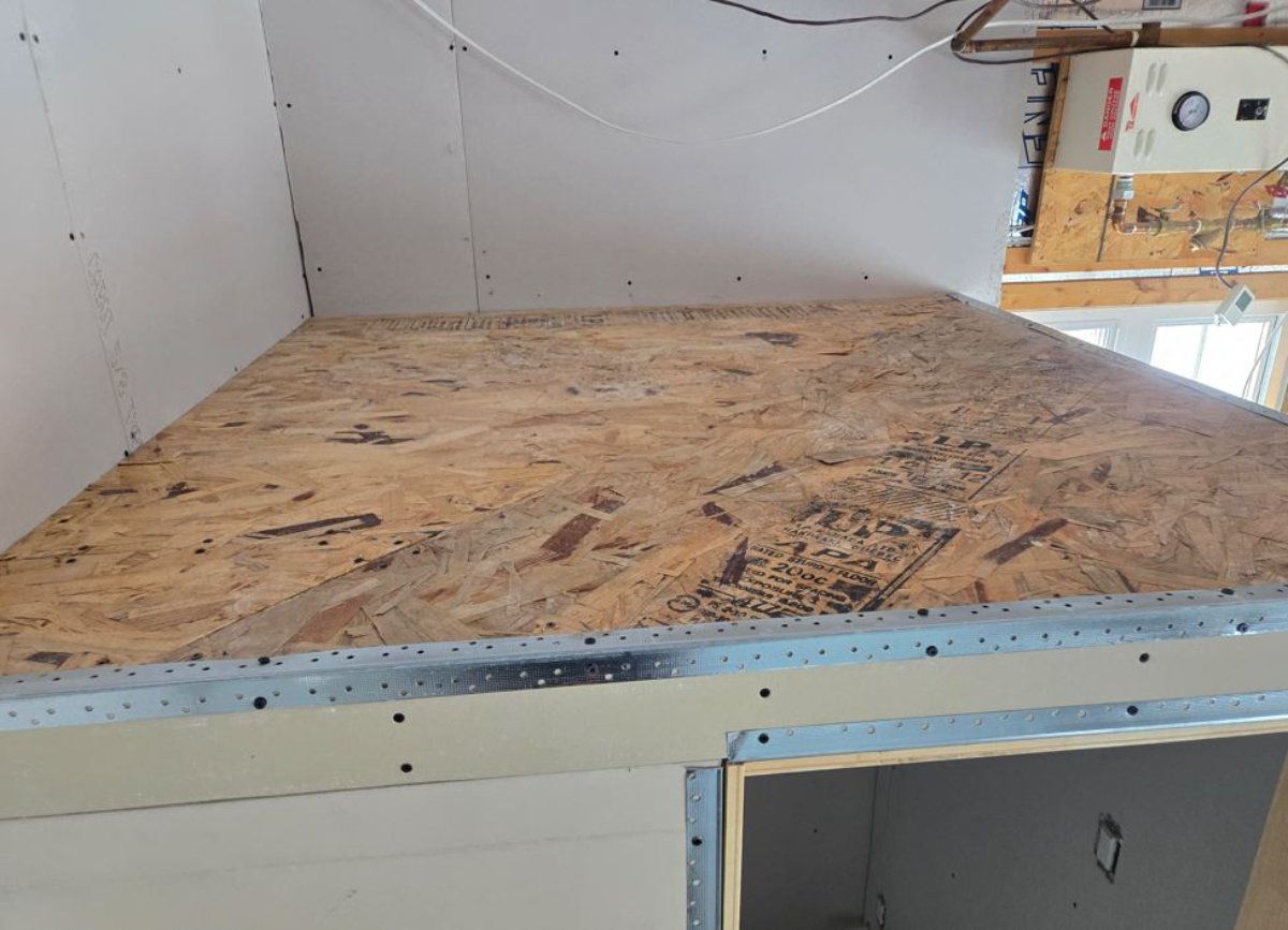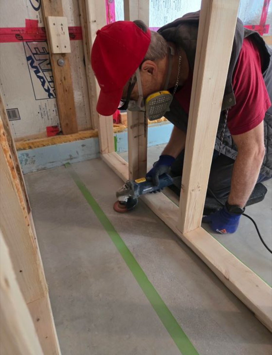 Since I have a glycol radiant floor, I can't risk puncturing a pipe by nailing the bottom plate. I glued it with PL Premium glue, but first I removed the concrete sealant to allow the glue to adhere better. And I put in a door to create a weight.