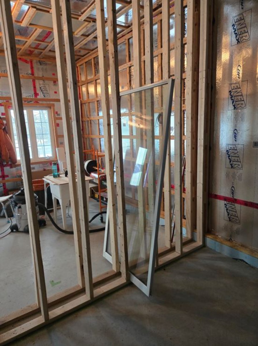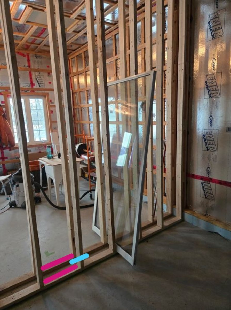 We then built the walls but without permanently fixing anything in order to properly build the frames for the 2 sliding doors and make sure everything fit together. When the structure was finished, we permanently fixed everything. Unfortunately, I didn't think to offset the studs on the second wall, which would have been better. But by putting wool between the 2 walls I might be able to reduce the impact of this mistake.