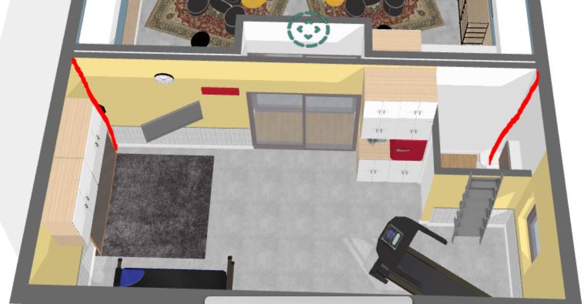 We finished laying the drywall and the plastering was done between April 11th and 16th (4 visits). I am very satisfied with the result. Before plastering, I put acoustic sealant in the 2 corners of the wall that separates the gym from the studio (red lines).