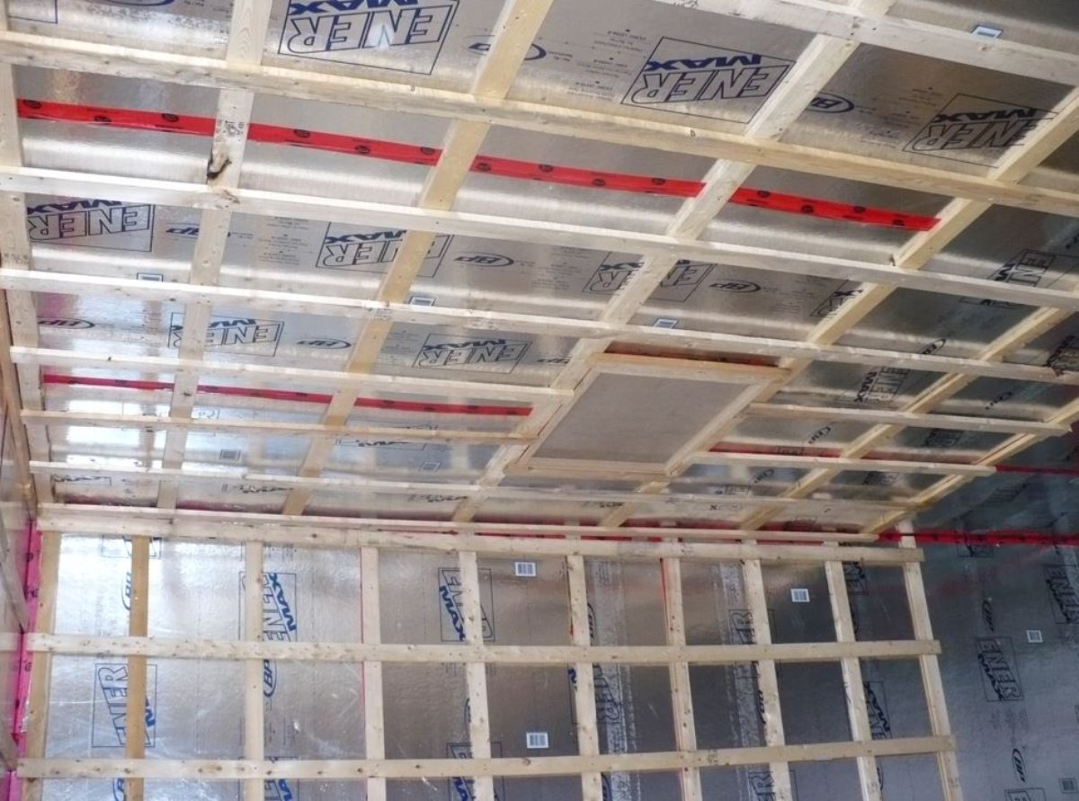 The dividing walls start about 11 feet from the front wall. Since there was no 2x6 stud at that distance in the left exterior wall, we added a stud to secure the first dividing wall. But we didn't add a stud for the second wall because the next stud isn't far away. This results in a 4-inch gap between the two walls (between the end of the 2x4 on one wall and the beginning of the 2x4 on the other wall). However, in order to align with the other exterior wall, we had to add 2 studs in the other exterior wall. For each stud, one bracket at the bottom and one at the top (on the same side of the stud), plus 2 nails. Finally, re-nail the Enermax strip and red tape.