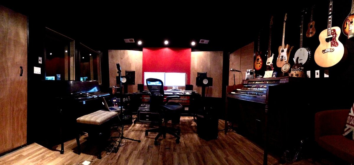 Control room (complete with Hammond organ along with a true Leslie box, plus an upright piano!): "Mini Live Room" with stone wall: