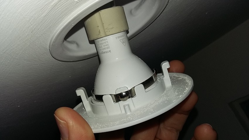 The downlight fitting is pretty massive, made from thick metal and fits flush to the plasterboard ceiling with a proper gasket. a couple of clips grip the drywall from the side, and two springs above hold it in place vertically;