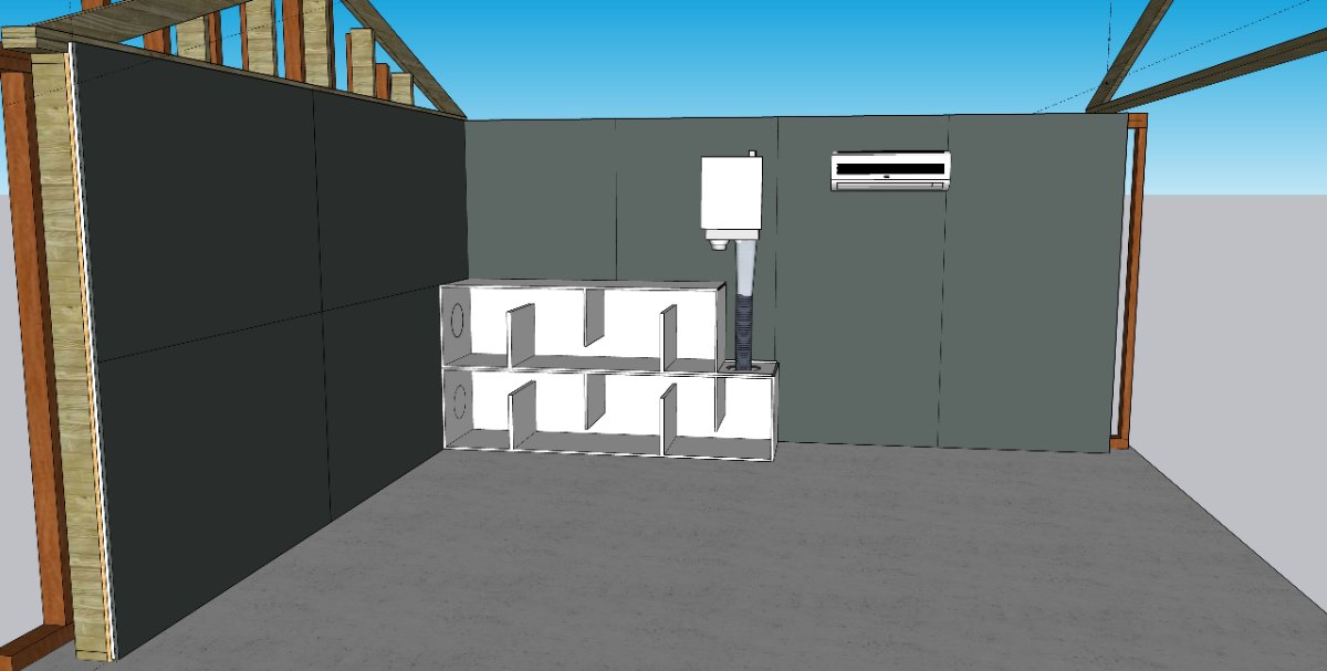 here is a sketchup of my idea. It is a VERY rough sketch, but just enough to give you an idea. The HRV will be on the wall to the left of the mini-split. The fresh air vent on the HRV is on the right side, so that air will hit the mini-split immediately after leaving the vent. Both ducts will go down and enter the baffle boxes. The boxes will hit the south wall and the air will be brought outside via ducts inside the south wall.