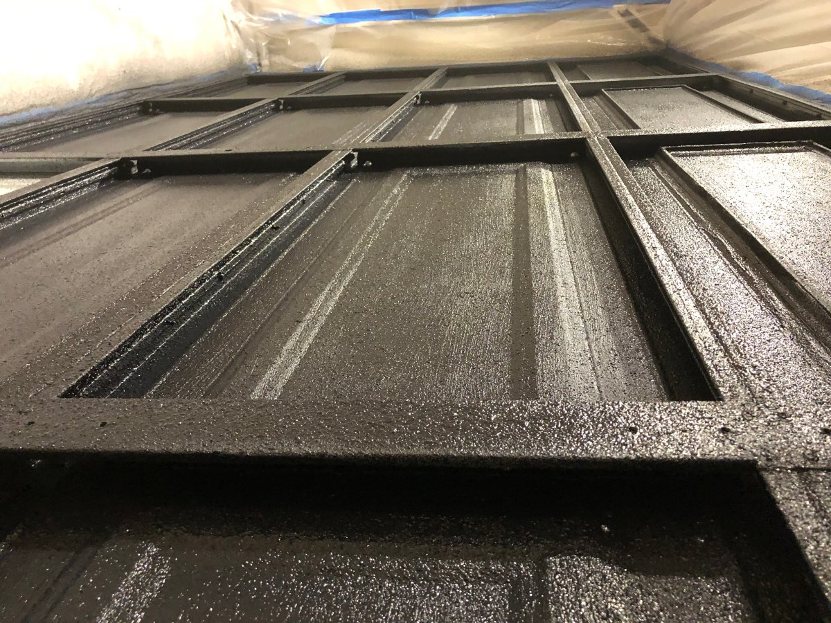 I coated the door with the second skin paint stuff. I did two coats, and the second coat was really thick, as that is what the manufacturer recommends. I used a spray gun, and it went on pretty easily. It's a very strange consistency though.