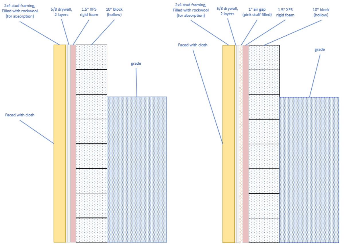 Given everything else being equal, which of these 2 wall designs would be the better option? Is the 1" air (pink stuff) just basically a waste of space, and would the single leaf design be similar, or even better? What about the concrete block wall itself ... does it already act as a 2 leaf because it's hollow blocks, or does the mass of the blocks, and the fact that the air gap is not contiguous negate that?