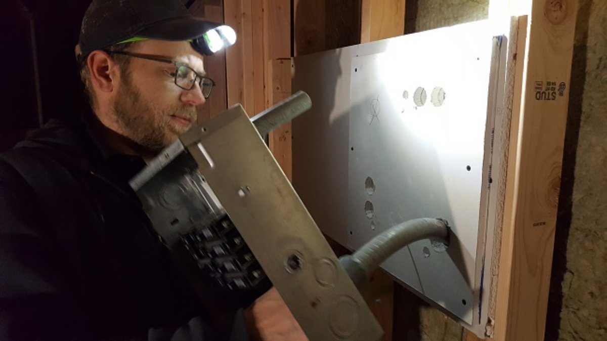 Moved breaker panel from old outer wall to the new inner wall. Had to put a small section of double-layer drywall (layers offset) for a place to mount the panel. This allowed me to be able to seal the holes on both inside (by reaching up behind) and outside the drywall and then get rockwool insulation in after mounting. (I did the same thing on the two heat pump units as well).