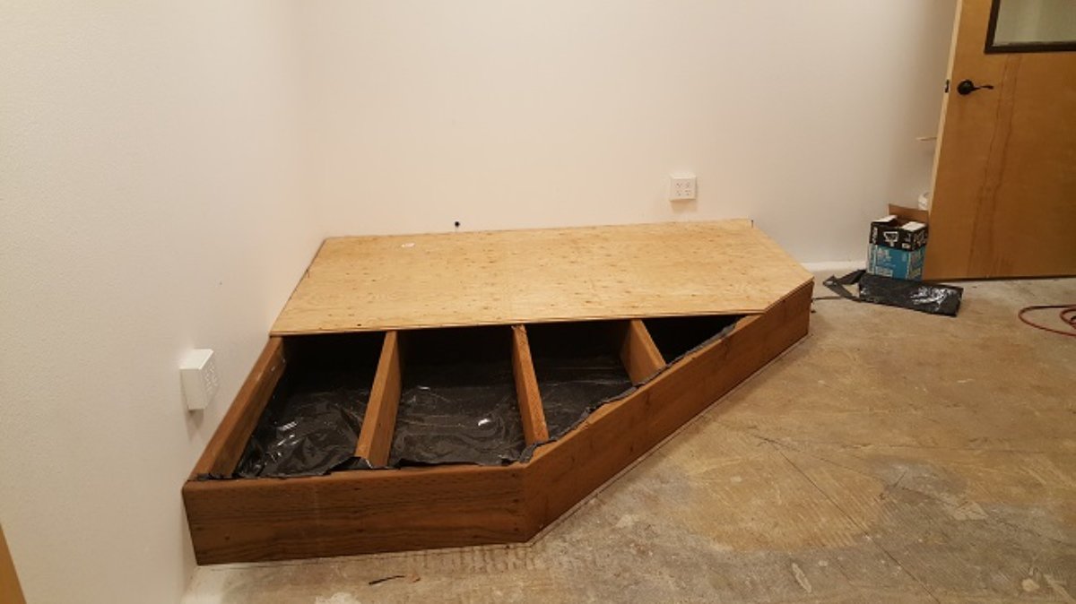 The room was a bit musty inside, with not much insulation. It had creepy indoor/outdoor carpeting and you could see light from underneath the double doors in the back! On September 27, 2014 we started the first physical work by gutting out the inside walls. The ceiling wasn’t figured out yet. The people were eager go get started, which made me uneasy, since there was so much research to do yet.