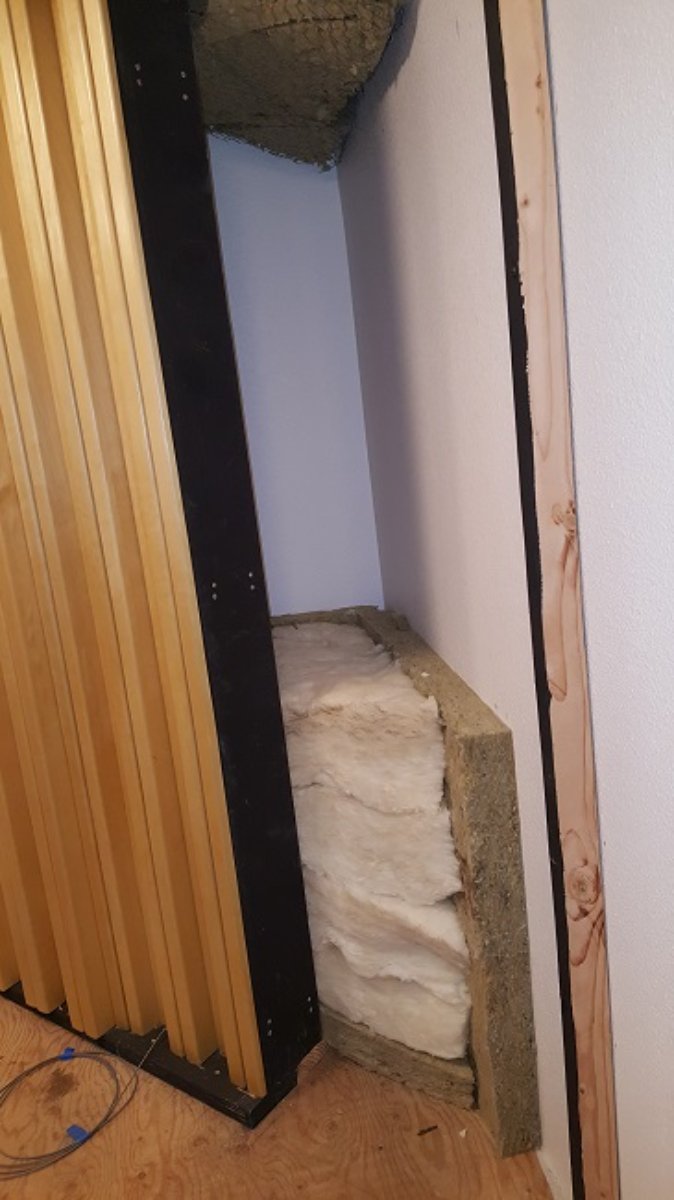 Outer layer of Rockwool insulation, 3”x16” batts (Roxul Safe-n-Sound).