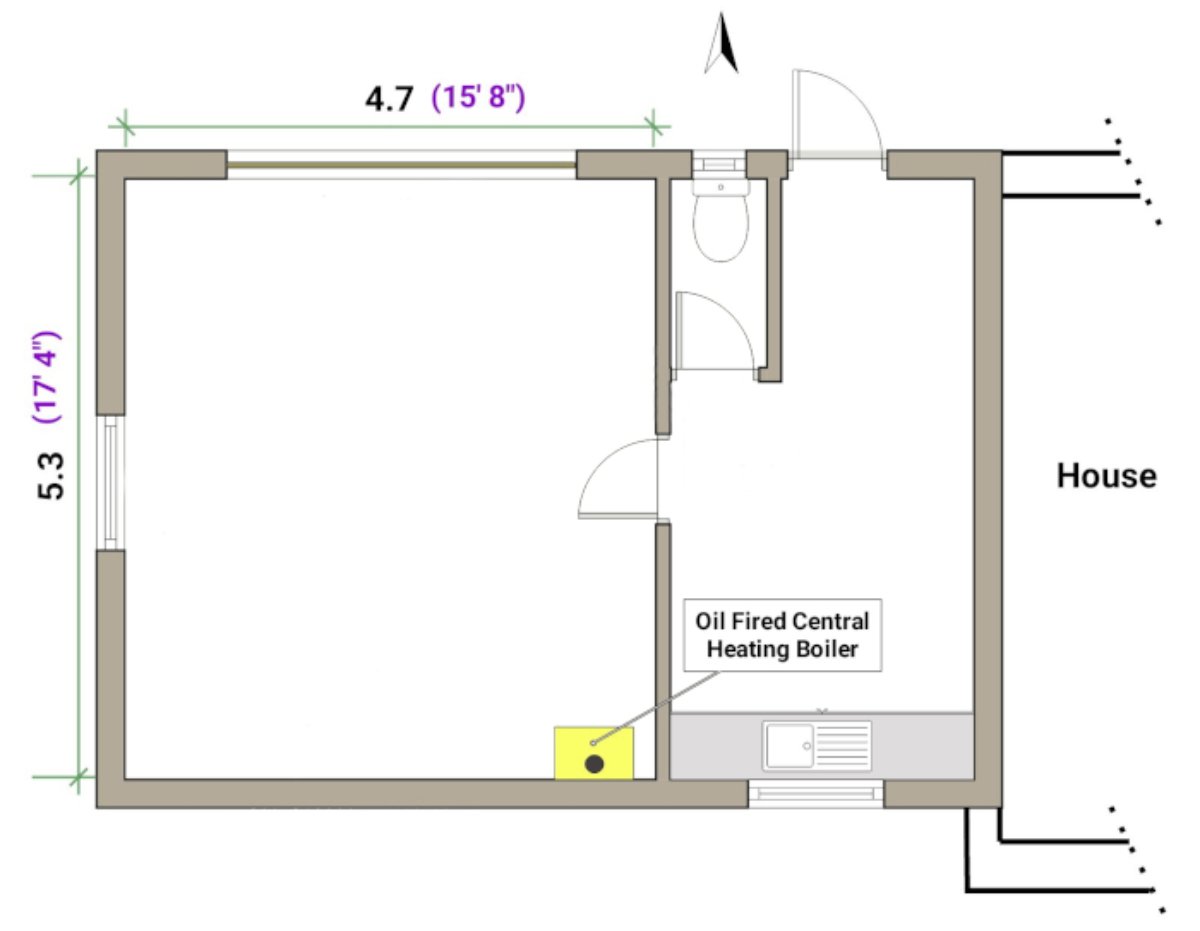 Finished room dimensions are 4.9m x 4.4m x 2.3m high.