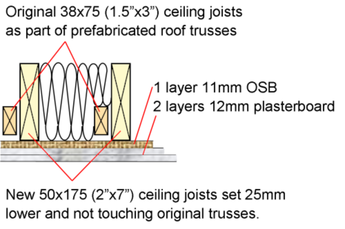 Room in room construction using fluffy filled timber stud walls and ceiling using OSB, plasterboard and lots of caulk!