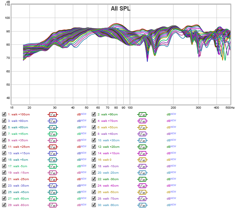 OK, one more. A not-so-usefull-but-rather-cool one. The animated graph below is the complete walk from the back wall to the front wall of the same studio as all the other graphs on this page. OK, so its not ALL the way from back wall to the front wall, because REW only allows up to 99 measurements in one MDAT file and the room is longer than 198 inches. So this animation runs from 102 inches (2.6m) behind the mix position, to 90 inches (2.3m) in front of it. The rest of the room isn't that interesting anyway, but this gives you nearly 6 meters (16 feet) of "walk". In this case, you are starting at the BACK of the room, and walking FORWARDS, towards the speakers.