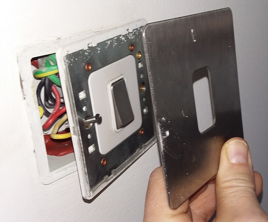 Apropos to Stuart's post above, some rooms in my house have screwless brushed metal faceplates on the light switches and sockets. I took one apart to measure and examine the construction. Single gang, UK type;