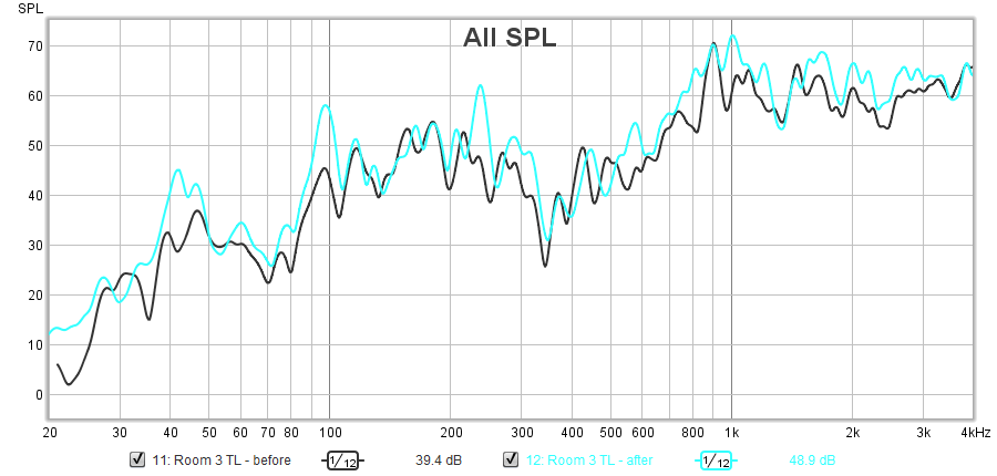 Next take the measurement mic to room 3 and repeat the sweep with the amp directly on the floor. The amp was directly on the floor for the "before" tests too. Here are the before and after sound isolation improvement measurements;