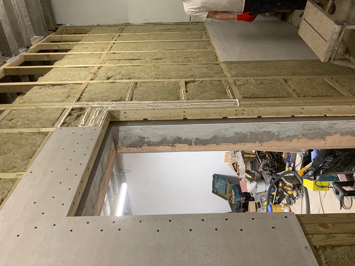 We boarded as high as we could, then got the green glue out sealed all the joins and gaps and green glued some of the second layer staggering joints, using less fixings than the first. It’s slow going as we have to pilot the cement board and counter sink, then drive drywall screws in which ruins the PH2 bits! It feels solid and super solid around the door!