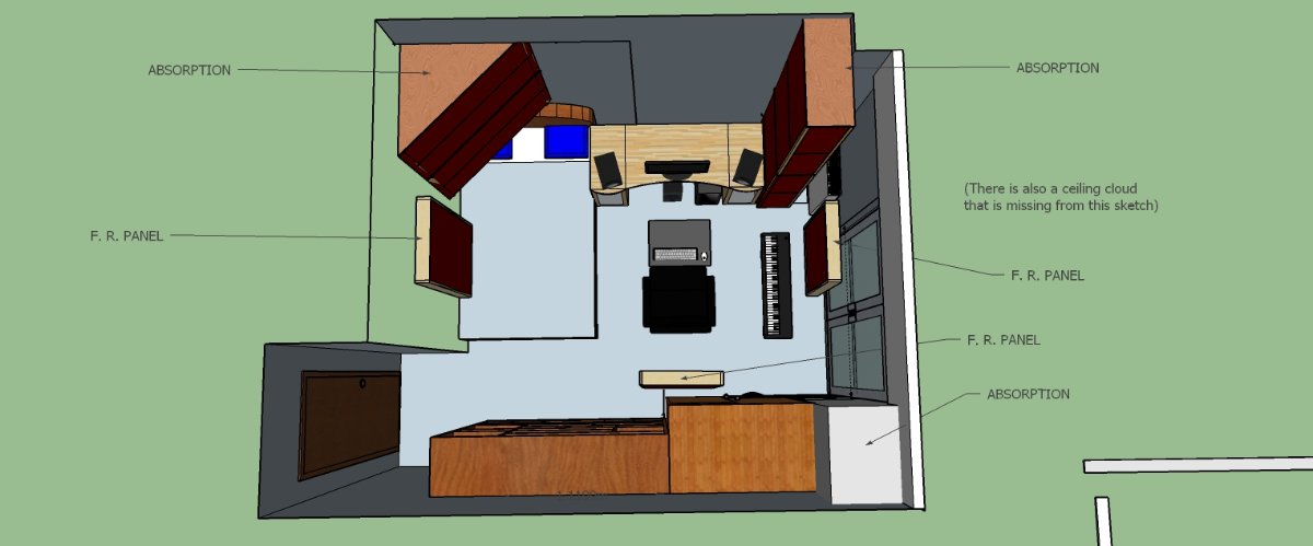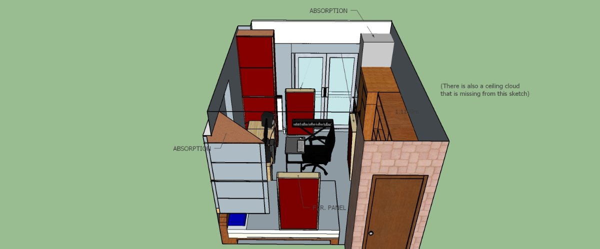 Related to the above, there are several "philosophies" or "concepts" for building control rooms, with names like "NER", "RFZ", "CID", etc. Each of those precisely defines the acoustic response characteristics that the room must achieve. One of those is the ideal "20-20" criteria, which means "20ms delay, 20 dB down". (And that's also where my screen name comes from! "SOUNDMAN2020" has nothing at all to do with the year 2020.... I've been using it that name more than a decade now! It's all about this "20-20" criteria that a room must meet in order to be good: no reflections greater than -20 dB in the first 20ms). Now, that's the ideal situation: to not have any reflections at all for the first 20ms, but to do that properly means that you need a large room. Sound travels roughly one foot for every millisecond, so you need to have at least ten feet between your head and the closest reflective surface behind you, plus there's often a 3 foot deep bass trap behind that reflective surface, so you need at least 13 feet distance just behind your head, plus a corresponding distance in front of you... thus, a room that fully meets the 20-20 criteria needs to be abut 20 feet long. That's a bit more than 6m long. Most home studios are not big enough to do that, so we have to make do with shorter times. 15ms is reasonable, and down to about 12ms is still acceptable. Now, as I mentioned before, as the delay time gets shorter, the level needs to be lower in order to not produce serious psycho-acoustic artifacts. So, while a level of -10dB might be fine for a large room with a long 25ms delay, you do need more attenuation for a small room.
