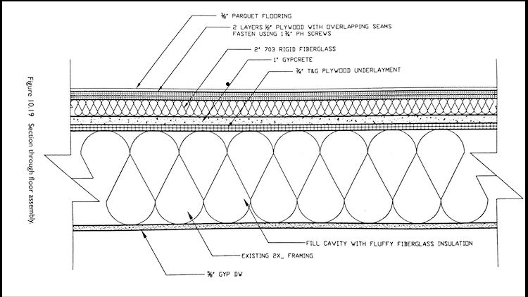 If I don't completely float a new floor assembly and go for a decoupled solution as in figures 10.16 and 10.19, my thinking is to add as much Gypcrete mass as possible, replace the two layers of 1/2" plywood with two layers of 3/4" MDF, and apply 2-3 tubes worth of Green Glue (per 4'x8' area) between all solid faces. The entire studio floor would essentially resemble the Glenn Drum Riser design sitting on top of Gypcrete.