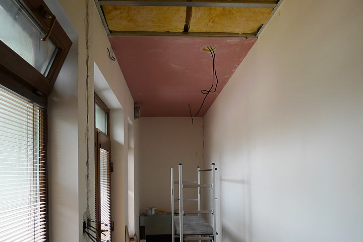We filled the rest of the day by putting up the first couple of boards for the new ceiling in the hallway.