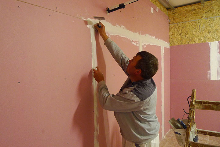 This week's real work consisted of just one day when Joseph, the builder, and I added more plasterboard to the front wall, three layers. Every layer has plasterboard filler while the final layer has filler and scrim (I like the US phrase mud and tape). The edges of every layer get backer rod and caulk. Here is Joseph adding the scrim, aka joint tape.