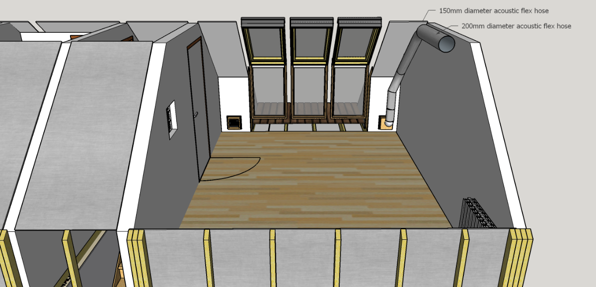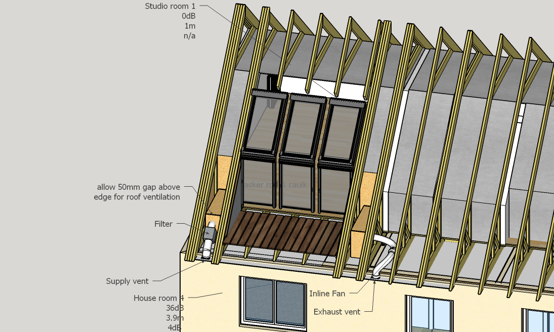 A. From studio to eaves, the isolation should be similar to that of the short wall i.e. two layers of 15mm drywall. So the silencer box walls should match this. Once in the eaves, the open soffit vents imply a ventilated deck, meaning not amazing isolation from there to outside. In number terms, the outside isolation to match is the large windowed expanse, which Velux claim is either 35 or 37 dB. Again, a single set of silencer boxes should do this. The inside isolation to match is 36 dB to the room below, and again a single set of silencers should suffice.