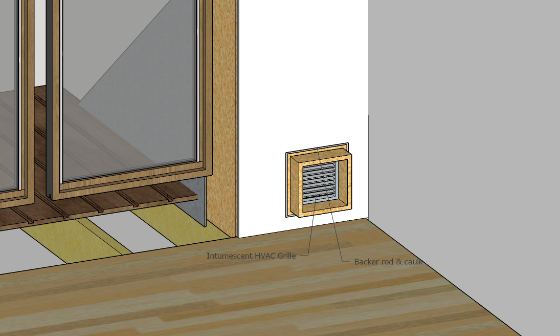 The sleeve for penetrating the room inner leaf has inside dimensions of 200x200mm giving 400 cm2 cross section. Caulk and backer rod will decouple the sleeve from the room inner leaf.