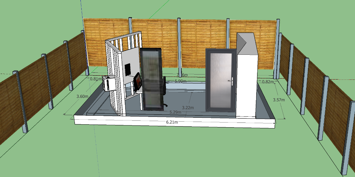 I have started a very vague plan for the room, as can be seen in the screenshot below. Air silencers will be located in the gaps between the joists for the ceiling(s) and the whole building will be sunk into the ground so that the top of the concrete block is 350mm below ground level. This will give me enough head height whilst staying within the permitted development rules. The highest part of the building (the front) will be 2.4m about ground.