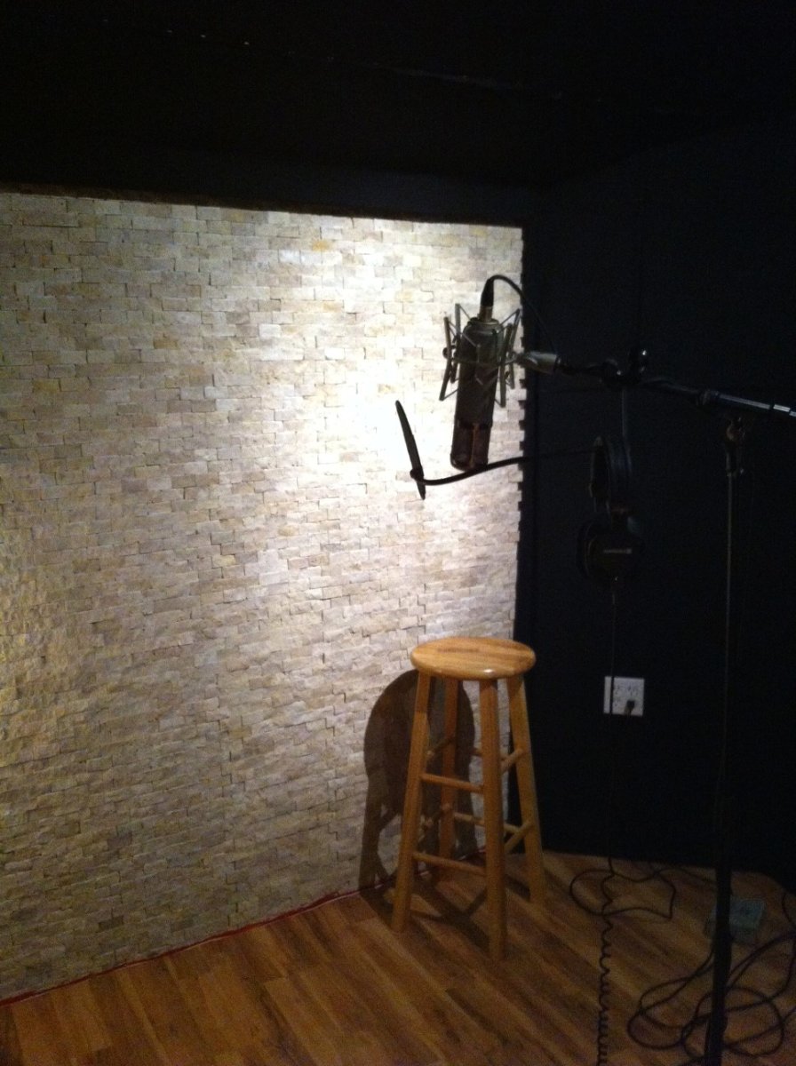 Control room (complete with Hammond organ along with a true Leslie box, plus an upright piano!): "Mini Live Room" with stone wall: