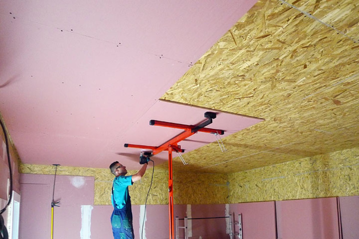 Up with the first layer of plasterboard. The lift proved its worth as it held boards flat while they were screwed in place.