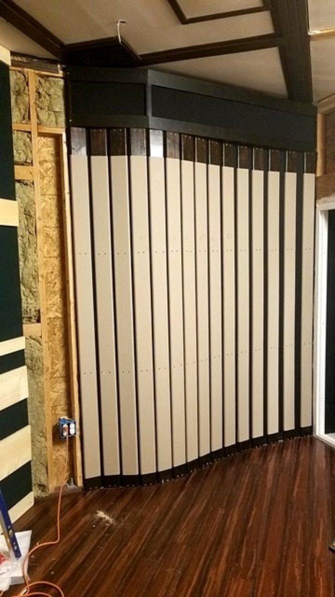 Right. But rather than lose more space for thick absorption back there, I'm thinking that a single large poly or wedge back there might be a better option. It would look nicer too, and not suck out even more highs like porous absorption would. Might be an idea. If it is decently large (wide and high) it should do the job well. Make it from flexible plywood, with "ribs" inside to give it the shape. Fill it with insulation, and you'll get some bass trapping too. And if you make it in the form of what I call a slot wedge, you could get some tuned Helmholtz action as well! Or you could do something I call a "slatted poly", which is the best of many worlds all at once: A series of vertical slats of varying sizes and/or with varying spacing between them, arranged along the same curve shape as a poly would have. Something like this: