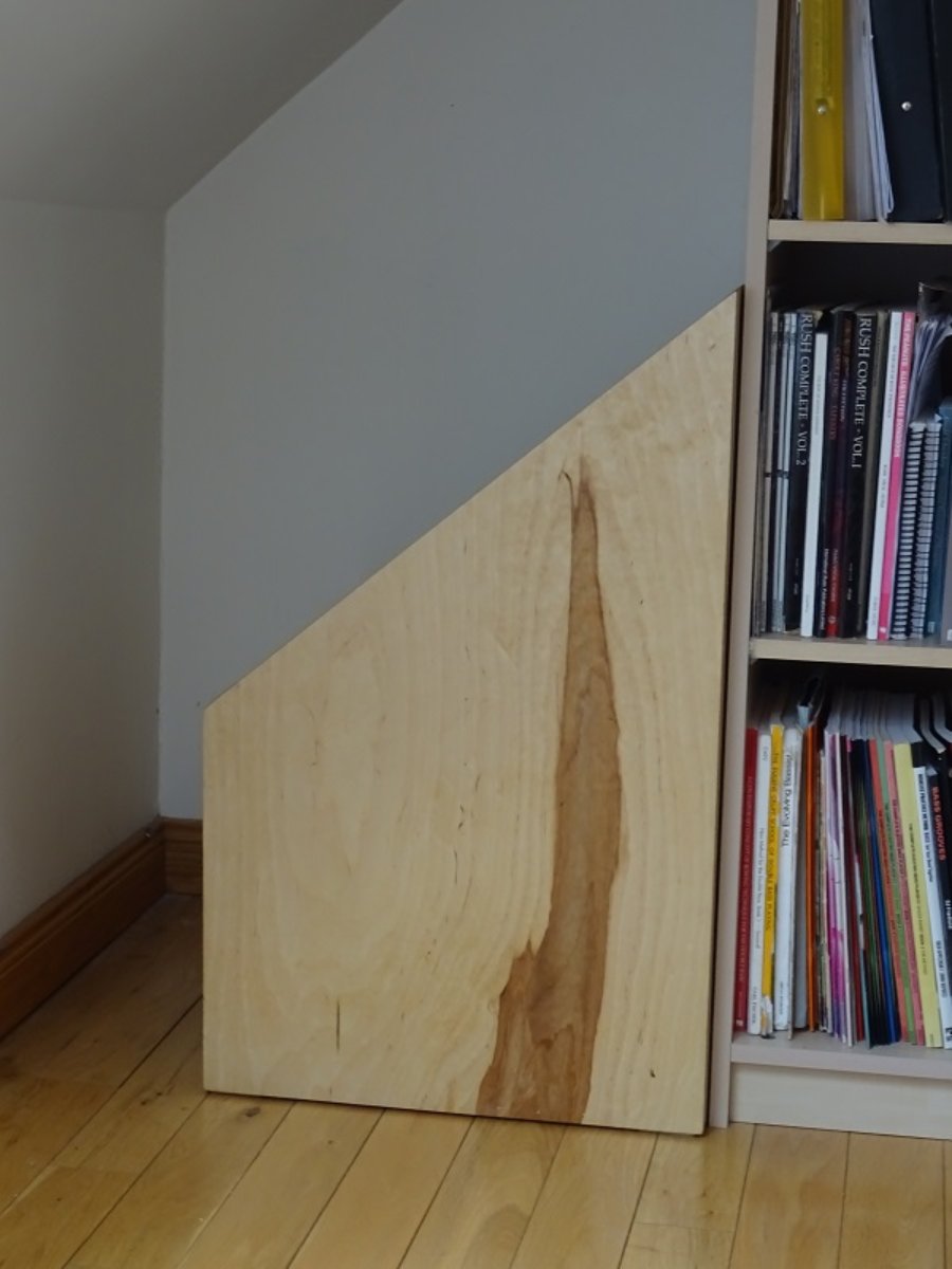 The room is a live room and has knee walls and sloped ceiling/walls in the corners. I had the notion of building a box to fit in the corner with a slope at the same angle of the ceiling, filled with pipes to store the mic stands. My wife came up with the idea of also cutting the faces of the pipes at an angle like a pipe organ.