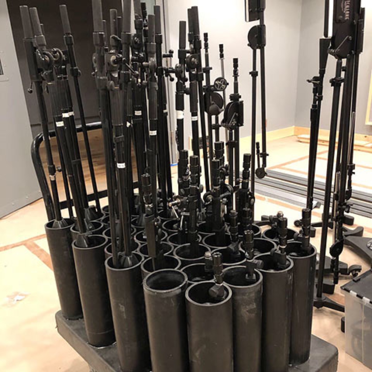 I've accumulated many mic stands of all sizes, from kick mics to orchestral overheads. Where to store them? I had them stashed in a corner of room 2, but they took up a lot of space, looked terrible and it was a nightmare to get the stand you want if it was at the bottom of the pile. There are many quick to make DIY storage methods, and it is possible to buy a large & expensive flightcase. But none of them was suitable for the room.